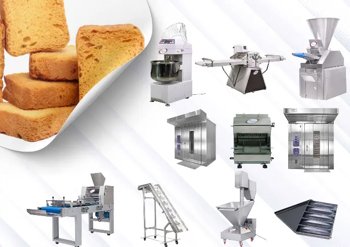 A Rusk Package is a comprehensive set of equipment and tools tailored for the production of rusks, which are twice-baked, crispy bread or biscuit-like products often enjoyed as a snack or accompaniment to tea or coffee. This package includes specialized machinery and essential tools necessary for rusk production.